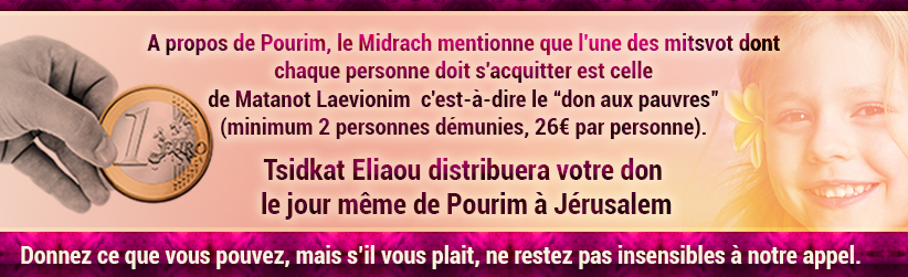 Les virements en Israël peuvent être effectués dans les devises suivantes: NIS, $US, $Canadien, €uros, £ Livre sterling, CHF Francs suisses Paiements par chèque bancaire: Etablir le chèque à l'ordre de TSIDKAT ELIAOU, adressez à Tsidkat-Eliaou POBOX 39151 Jérusalem 9139101 ISRAEL
