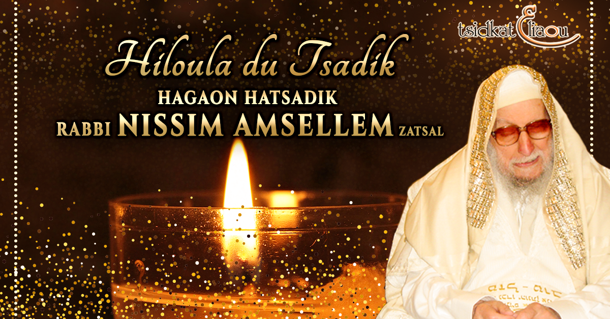 Cette année nous célébrons la 10e Hiloula du Gaon Hatsadik Rav Nissim Amsellem zatsal le lundi soir 2 mars et le mardi 3 mars 2026 toute la journée. Beau-frère et disciple de Sidna Baba Salé zatsal, il fut - entre autres- le cofondateur de Tsidkat-Eliaou et de la synagogue BABA SALÉ de Jérusalem, avec son fils monsieur Raphaël Amsellem Chlita. Sa formation, sa vie, son parcours rabbinique, ses immenses connaissances de l'univers toraïque, sa profonde sagesse, ses midot, ses maasim et son amour du Am Israël sont plus que jamais présents dans l'esprit des personnes qui ont eu la chance de connaître ce grand Tsadik.